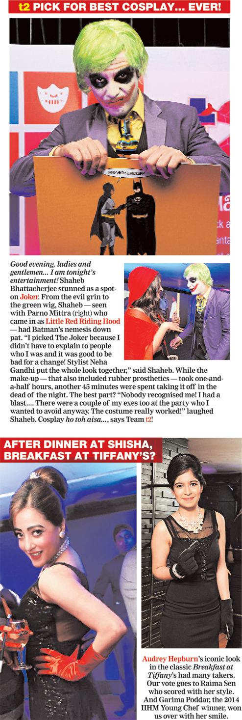 Good evening, ladies and gentlemen... I am tonight’s entertainment! Shaheb Bhattacherjee stunned as a spot-on Joker. From the evil grin to the green wig, Shaheb — seen with Parno Mittra (right) who came in as Little Red Riding Hood — had Batman’s nemesis down