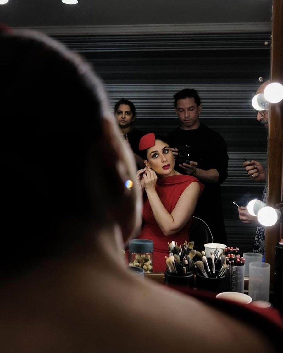 Kareena Kapoor Khan put on her red air hostess uniform in the makeup room while getting ready for her scene.