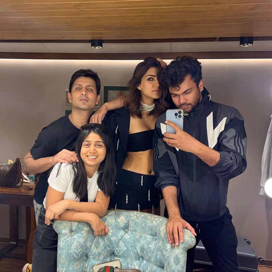 Kriti Sanon, clad in a black outfit and pearl necklace that she had sported for the Diljit Dosanjh song Naina in Crew, dropped a mirror selfie with her team members.