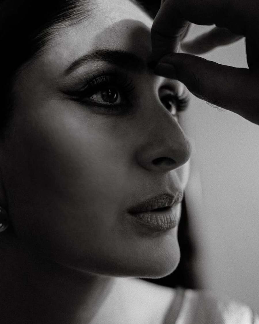 Kareena shared a monochrome close-up shot of her face during a last-minute touchup.