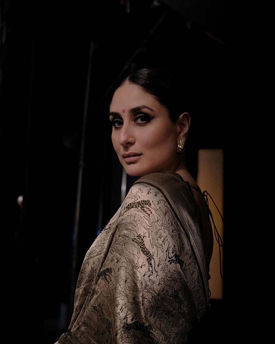 Kareena chose to wear a shimmering golden sari with monochrome images of tigers and deer imprinted on it.