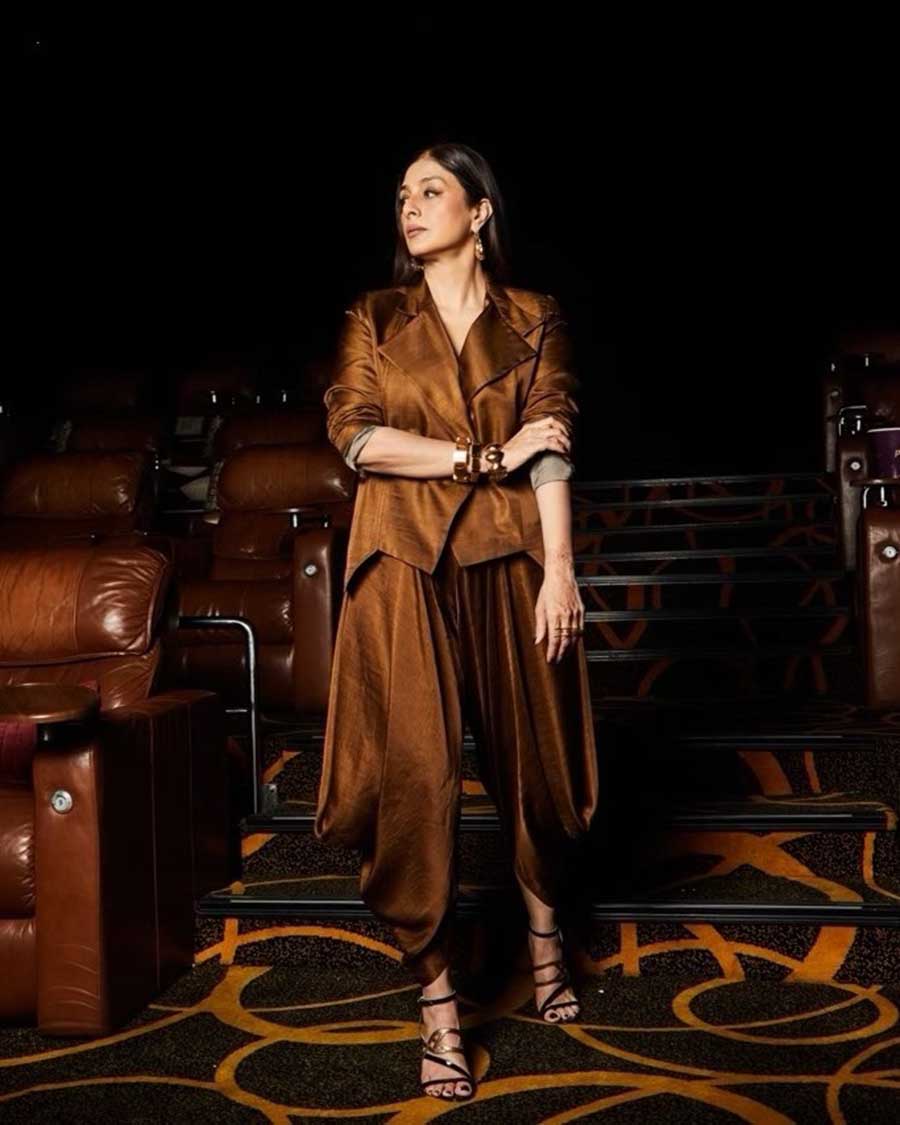 Tabu attended the event in a shimmery copper ensemble. She paired a collared jacket with matching dhoti pants and strappy stilettos. Metallic bangles and chunky hoops complemented her outfit.