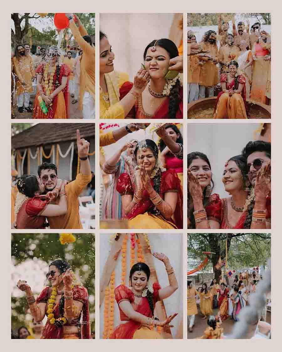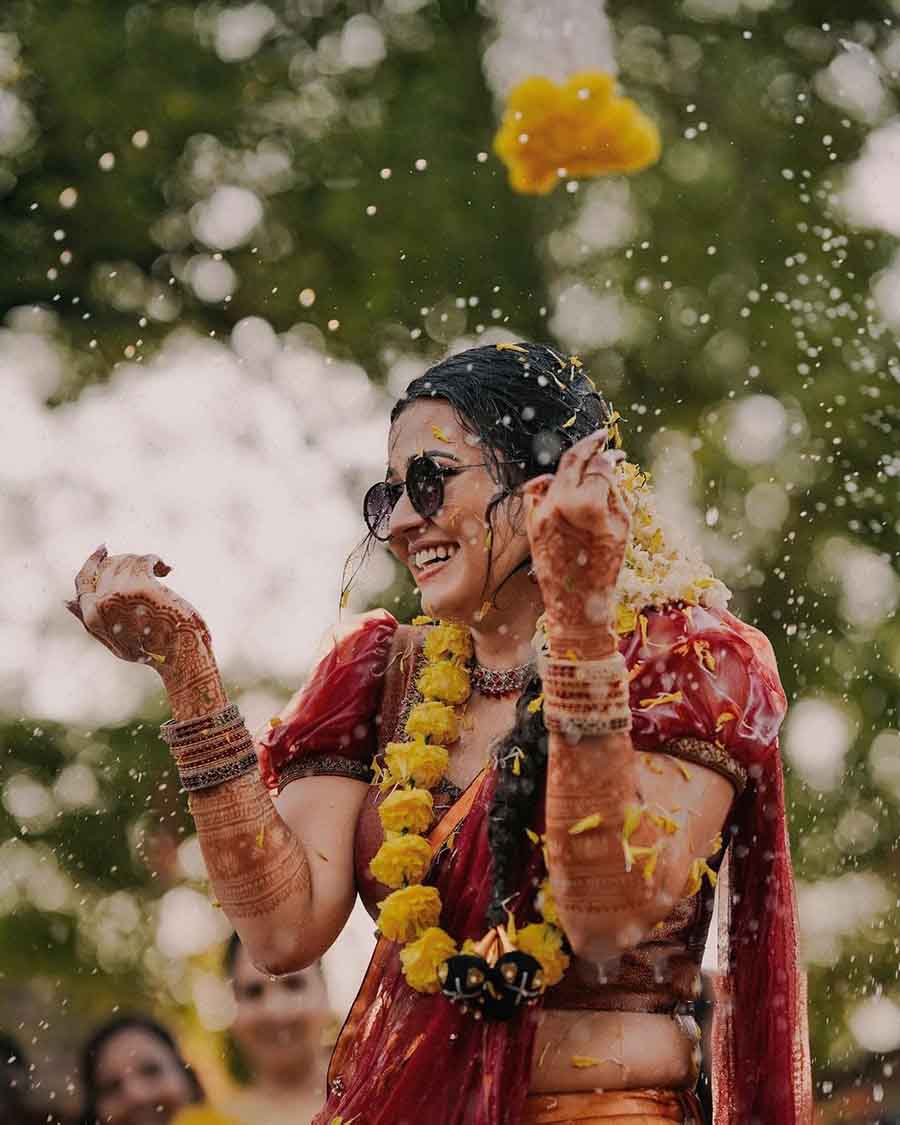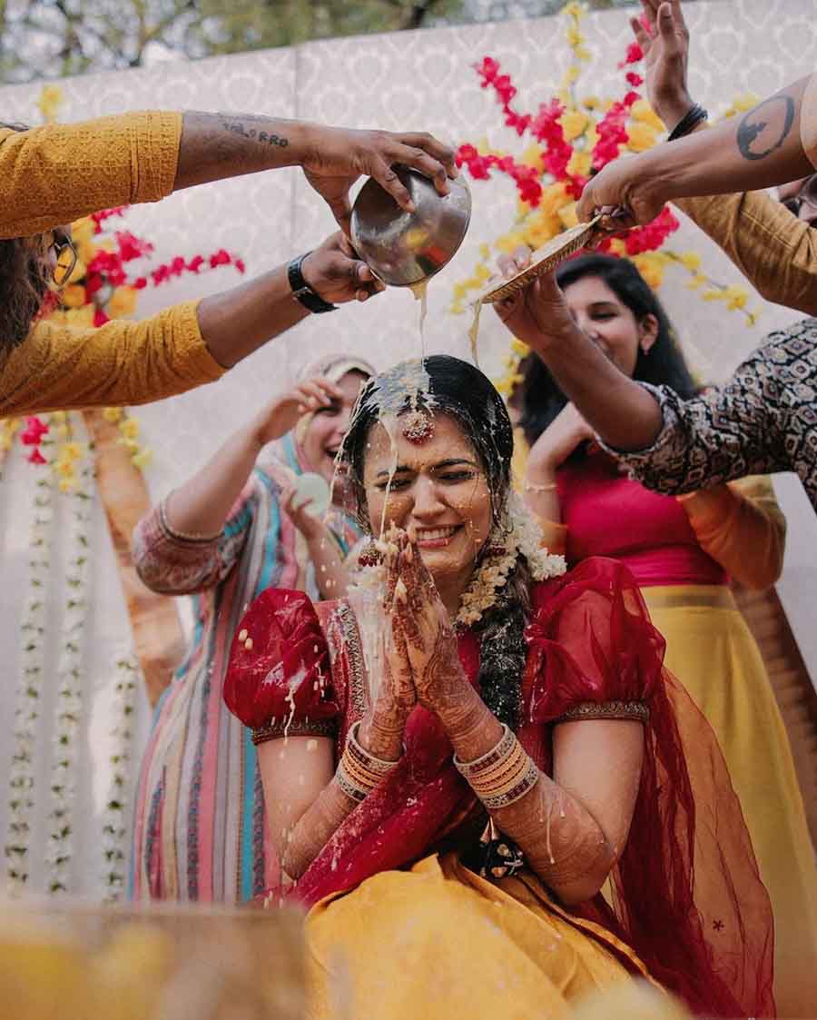 A drenched Aparna joined her hands while her relatives poured water over her head. The haldi ceremony was attended by Aparna’s close friends and family.