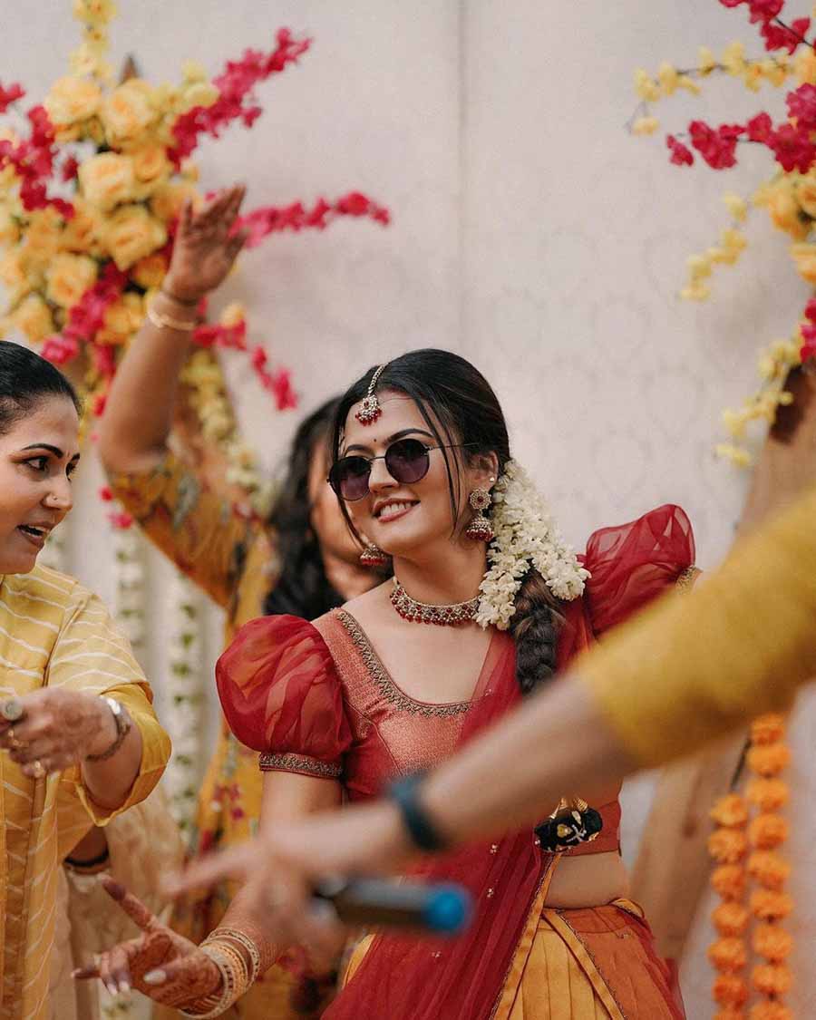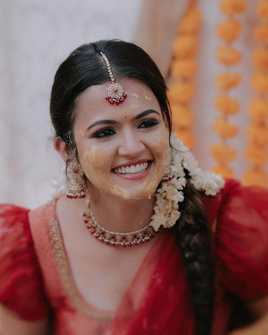 Clad in a red-and-yellow half saree for the ceremony, Aparna struck a pose for the camera in minimal accessories and gajra.