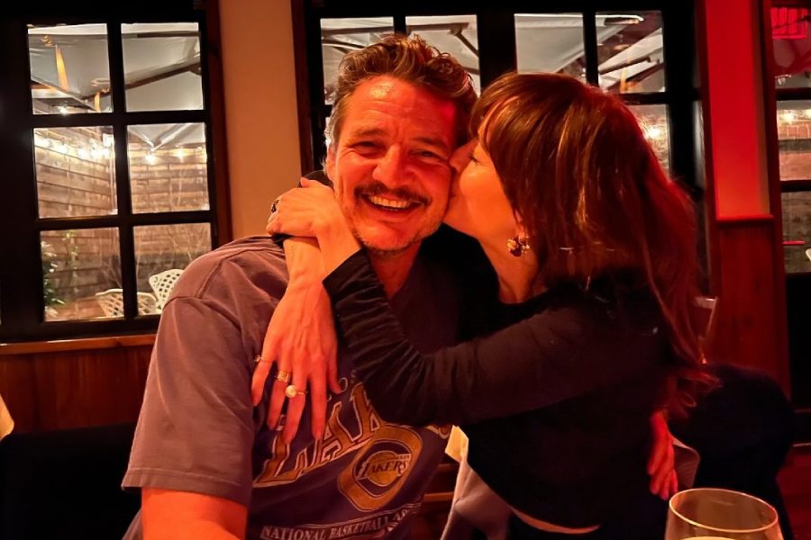 Dakota planted a kiss on Pedro Pascal’s cheeks at a cafe during the shoot.