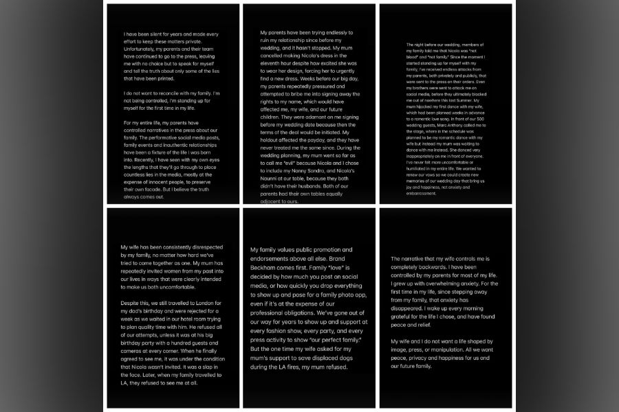 The statement focuses on David and Victoria’s alleged actions towards Brooklyn’s wife, American actress Nicola Peltz Beckham, who he said had been “consistently disrespected” by the family.