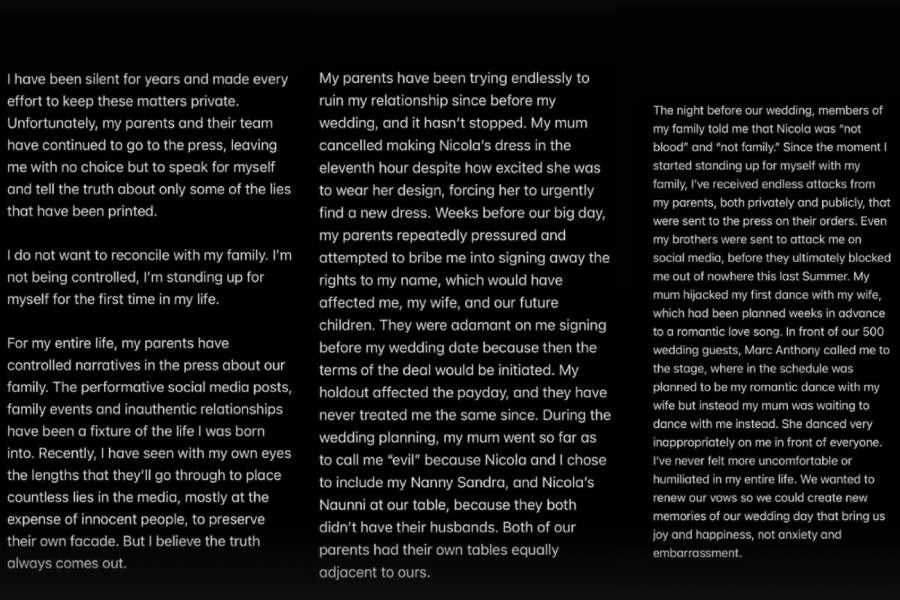 “Unfortunately, my parents and their team have continued to go to the press, leaving me with no choice but to speak for myself and tell the truth about only some of the lies that have been printed,” he added.