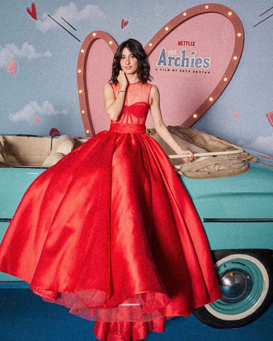 Debutants Suhana Khan, Khushi Kapoor, Agastya Nanda, Vedang Raina, Aditi Dot, Yuvraj Menda and Mihir Ahuja attended the star-studded special screening of their upcoming movie The Archies along with Bollywood biggies in Mumbai on December 5. Here’s a look at the newcomers’ fashion choices for the event.