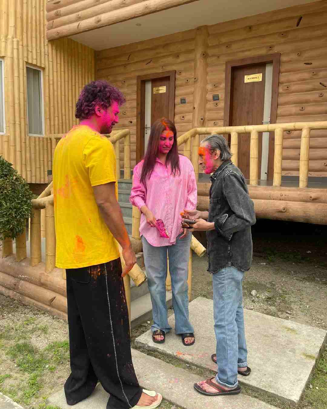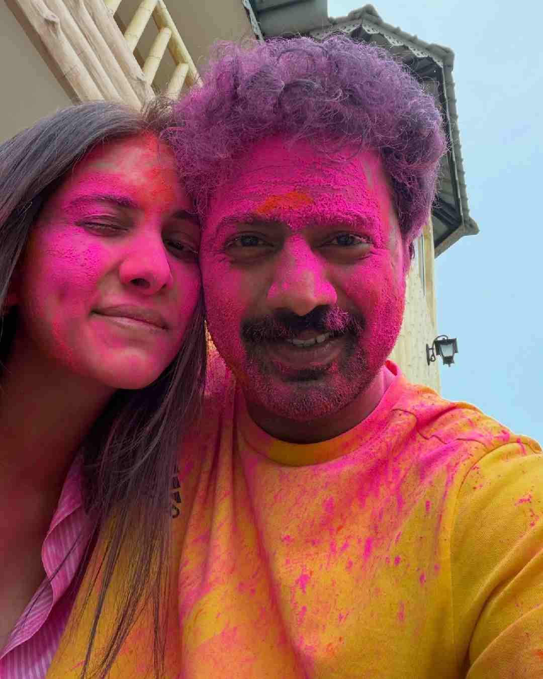 In one of the pictures, Dev and Rukmini, their faces smeared with pink gulaal, looked adorable in a selfie as the latter winked at the camera.