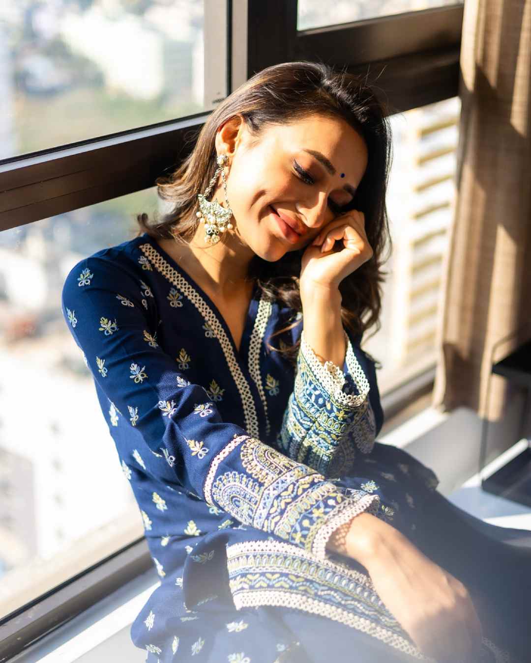 Mimi Chakraborty posted sunkissed pictures of her in a blue embroidered kurti set.