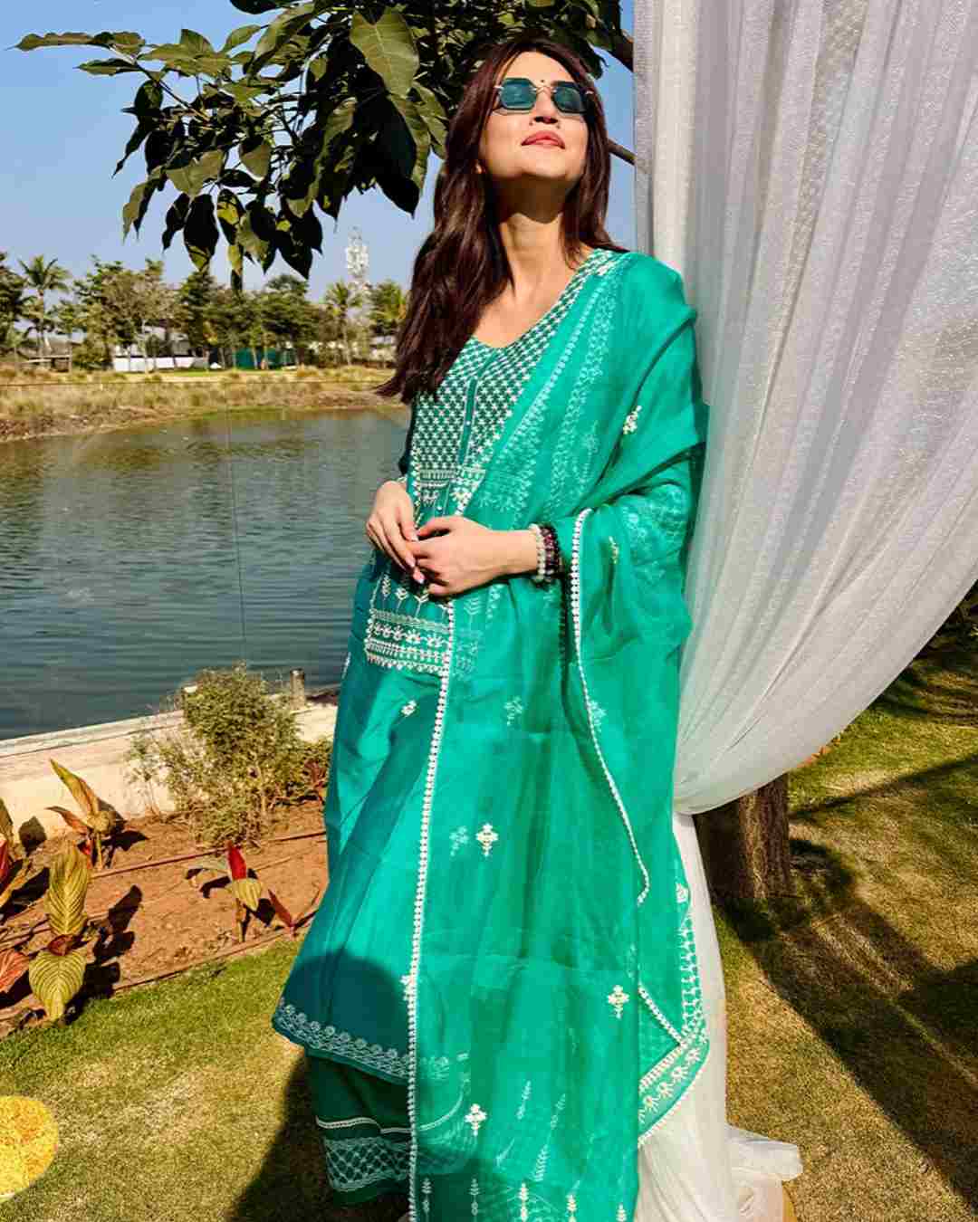 The Crew actress opted for a teal-coloured ethnic outfit — a kurta and palazzo set with a net dupatta, featuring intricate embroidery and a Bandhani print. She accessorised the look with sunglasses and a bindi.