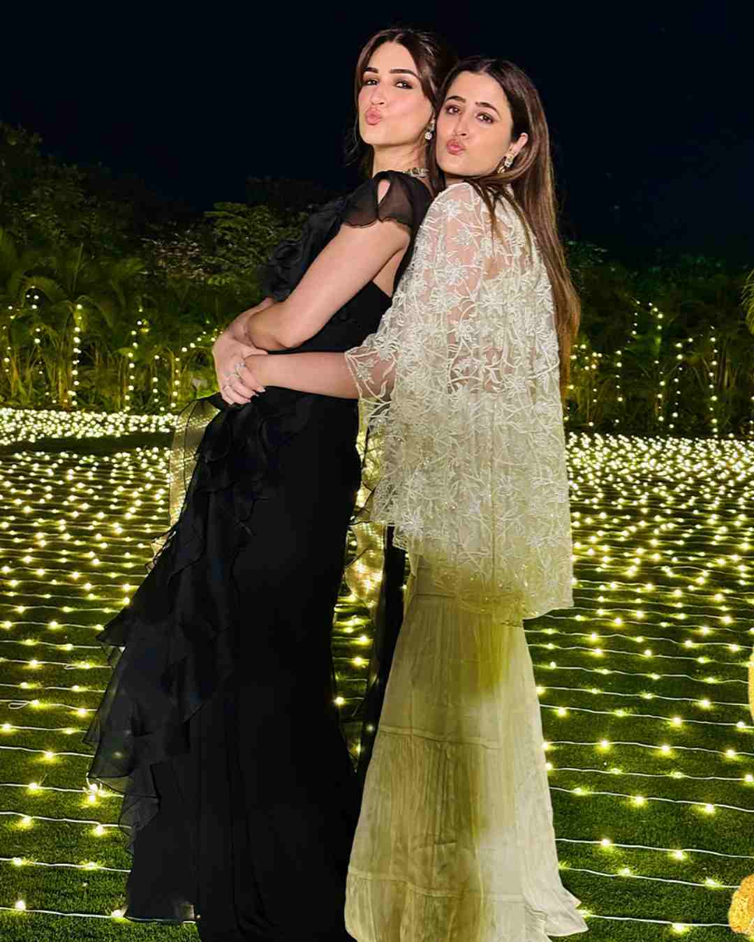 The actress posed with her sister Nupur Sanon, who also attended the wedding in an embroidered ivory-coloured sharara.