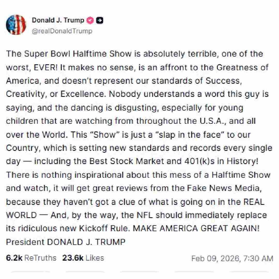 In a post on Truth Social, Trump wrote, “The Super Bowl Halftime Show is absolutely terrible, one of the worst, EVER! It makes no sense, is an affront to the Greatness of America, and doesn’t represent our standards of Success, Creativity, or Excellence.”