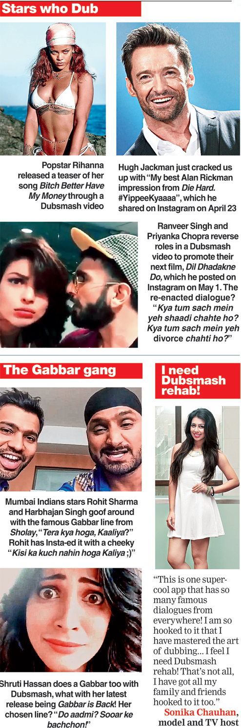 Dubsmash is a mobile app that creates short selfie or groupfie videos of 10 seconds where one lip-synches or “dubs” popular songs, iconic film and TV series dialogues, animal sounds, famous cartoon voices, trending ads and any other sound that may catch your fancy.