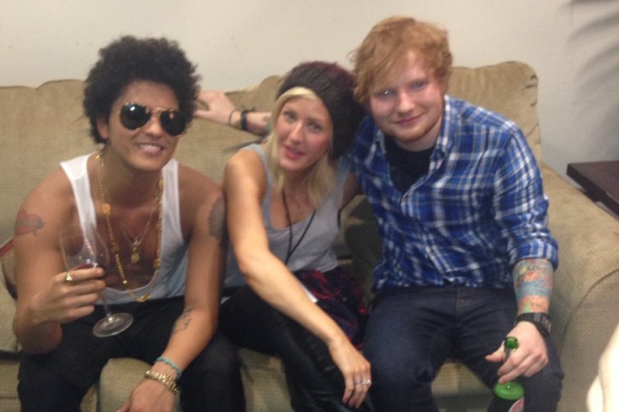 The singer had a fun moment with singers Bruno Mars and Ellie Goulding at a party.