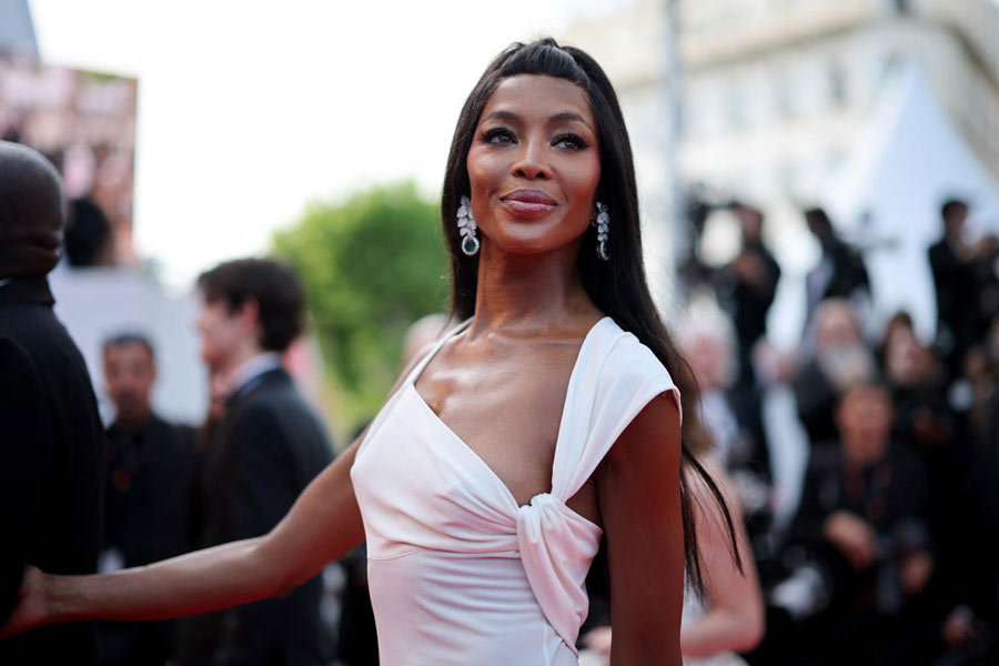 British model Naomi Campbell stole the show at Cannes Film Festival in a sans-sleeve white gown with an asymmetric square neckline and a knotted design.
