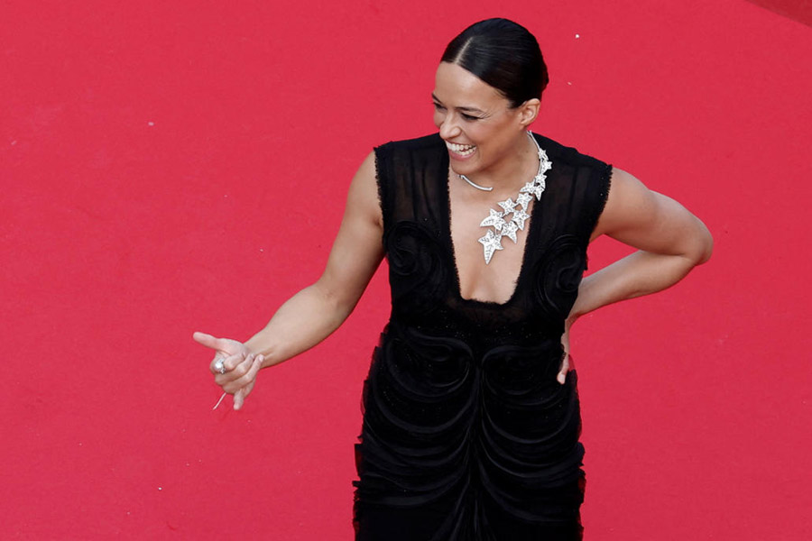 American actress Michelle Rodriguez looked gorgeous in a black embellished gown with a plunging neckline, accentuated with a statement necklace featuring leafy motifs.