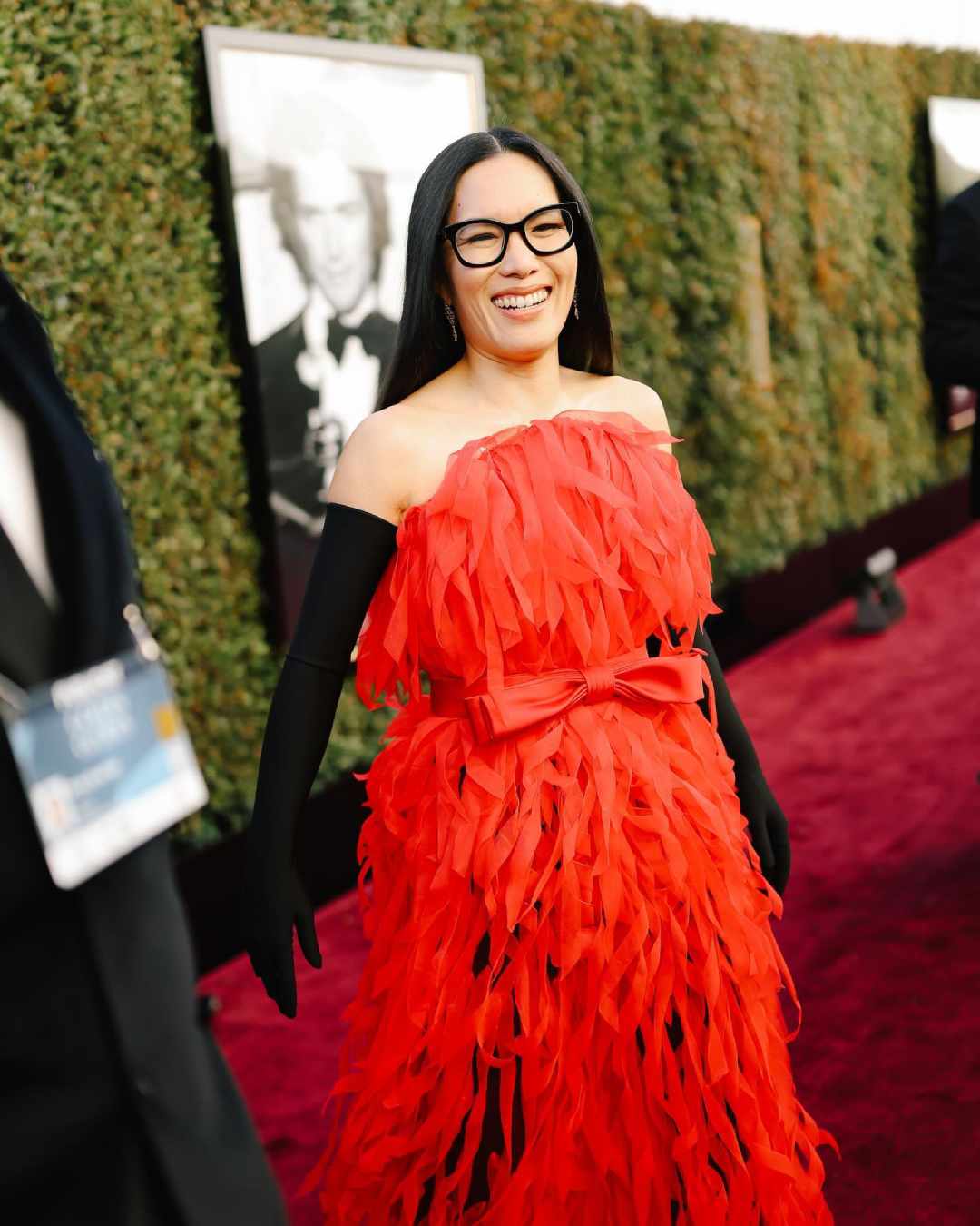 Ali Wong, who won best performance in stand-up comedy on television for her Netflix series Single Lady, stunned in a custom-made red Balenciaga gown with bold ruffles and a bow-belt cinching her waist. The Beef actress paired her ensemble with black opera gloves.