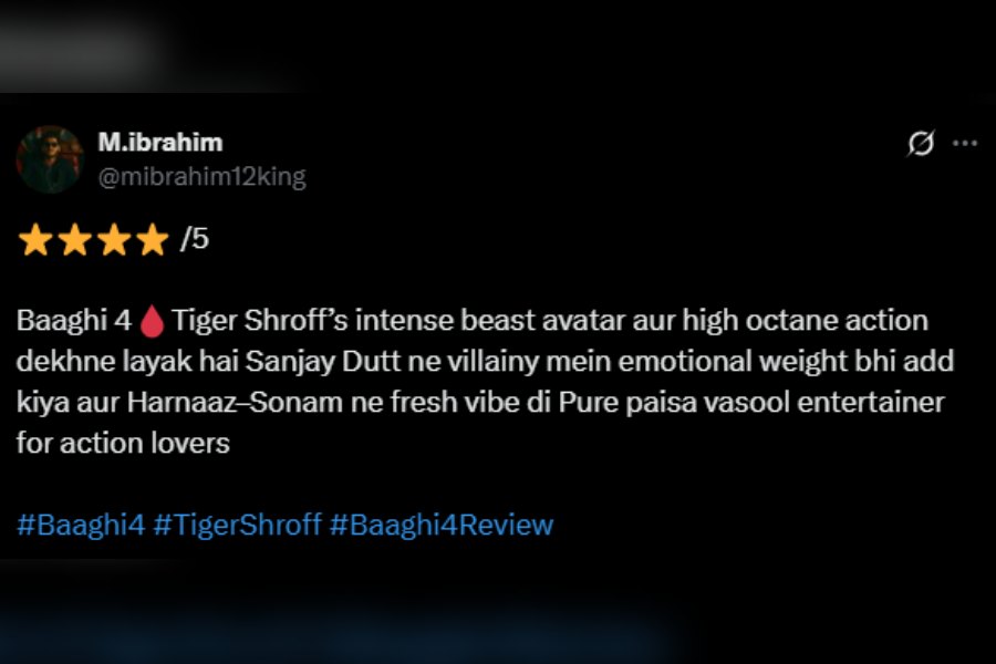 “In Baaghi 4, Tiger Shroff’s intense beast avatar and high-octane action is worth watching. Sanjay Dutt’s villainy adds emotional weight and Harnaaz Sandhu, Sonam Bajwa also lend a fresh vibe to the film. Pure paisa vasool entertainer for action lovers,” wrote an X user, heaping praise on the cast of the film.