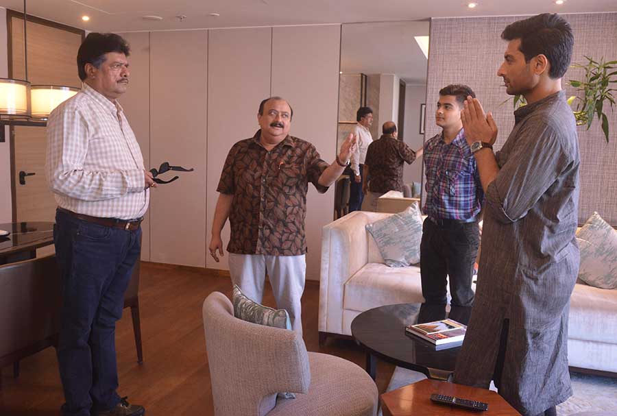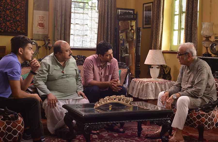 Mohan Agashe (far right) plays Hingorani, who meets Feluda, Jatayu and Topshe and asks for Feluda’s protection as he feels his life is in danger.