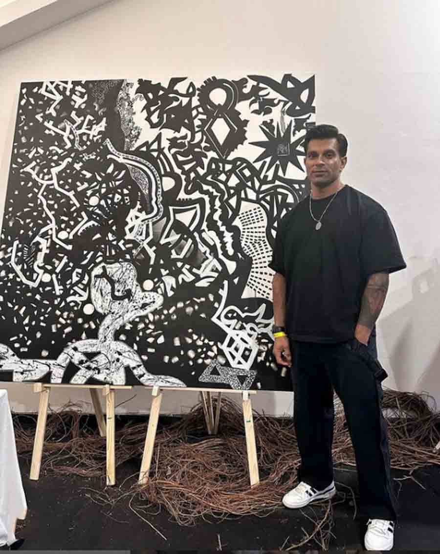 Karan poses with one of his artworks at an exhibition. ‘My depiction is based on my understanding of the state of flow or the flow state. Artists, musicians, athletes, martial artists sometimes either find themselves or work towards and achieve this state of being. It’s a state of being where movement precedes thought, where your body or being moves in a certain way before you think of it,’ Karan described his process of creating art. Elated wife Bipasha Basu cheered him with the comment, ‘Creator of beauty. So proud of you.’