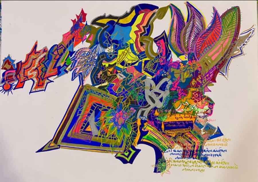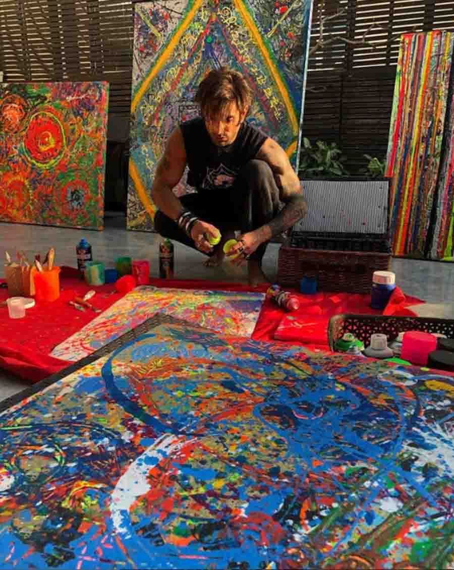 Surrounded by artworks at various stages of completion, pots of paints, brushes and other tools, Karan is deep in thought.
