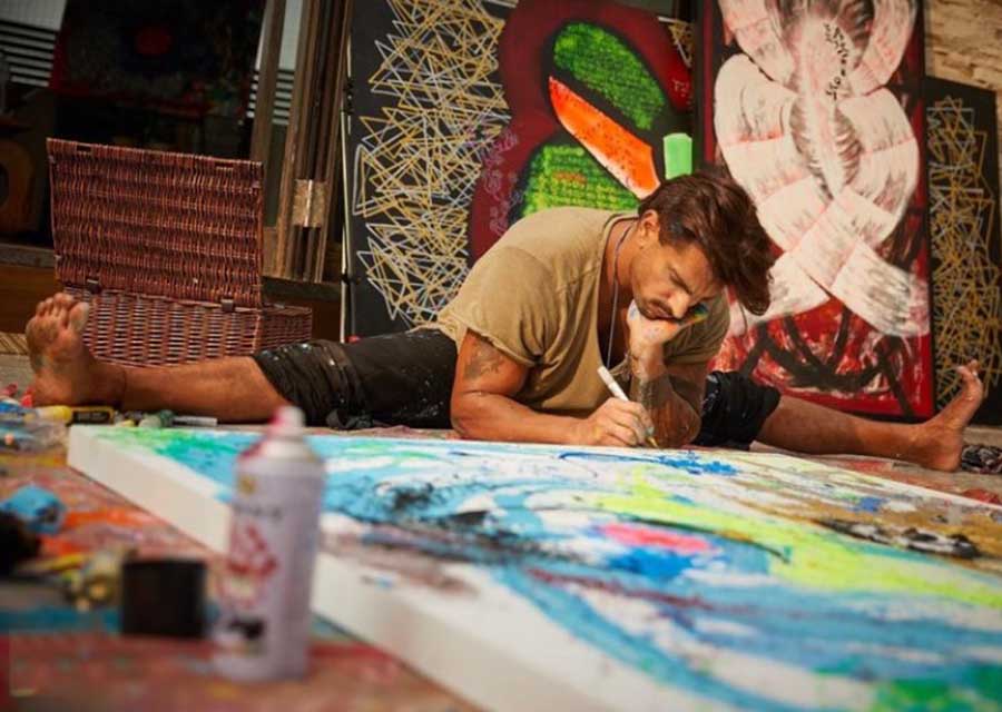 Smeared with paint, Karan is at work in his studio. A lot of his paintings have bright colours and bold strokes.
