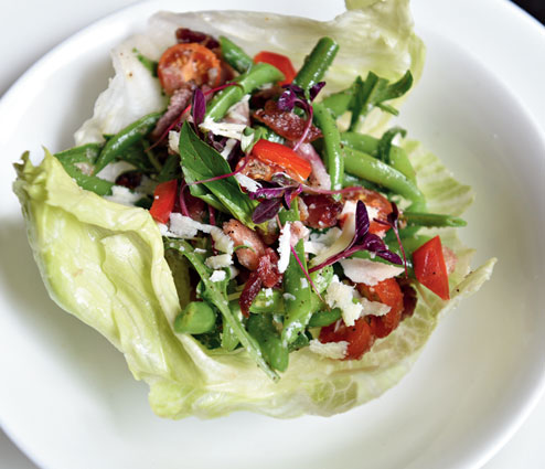 Shredded bacon, Parmesan cheese and broken pieces of bread croutons get a lot of greens like parboiled French beans, rocket leaves, amaranthus, mustard and oregano leaves for company in this summery mix. The salad is tossed with a mix of olive oil, mustard, salt and pepper and served in a pouch of lettuce. The salad menu has two other non-veg options and three veg options to choose from. Rs 200