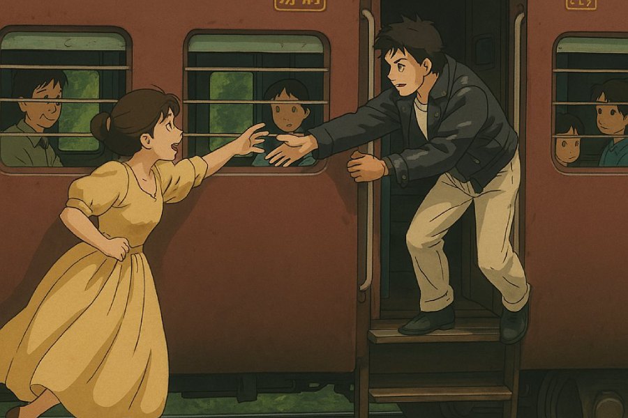 Are the characters above Raj and Simran from DDLJ, or do they look like Jiro and Nahoko from Ghibli’s 2013 film The Wind Rises? The soft hues, nuanced gestures and nostalgic charm bring a new perspective to a beloved cinematic moment.