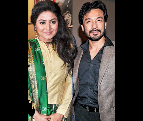 (below) director duo Abhijit Guha and Sudeshna Roy at the premiere of Benche Thakar Gaan at Priya. Pictures: Pabitra Das