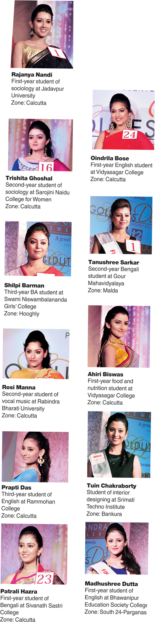 The grand finale will be held on June 26 at Nicco Park, from where one of the 28 girls will be crowned this year’s Goldlites Diva. She will take home a gift voucher worth Rs 1 lakh from P.C. Chandra Jewellers. The runners-up will win privilege coupons worth Rs 50,000 and Rs 25,000. Winners in the sub-categories — Miss Photogenic, Miss Beautiful Smile, Miss Beautiful Hair, Miss Beautiful Eyes, Miss Confident, Miss Congeniality and Miss Perfect Catwalk — will get gift vouchers of Rs 10,000 each. The Goldlites Diva 2015-16 journey began last September with 8,000 girls from across 19 districts in Bengal, plus Calcutta. t2 introduces you to the fab 28...