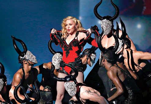 The 56-year-old Material Girl gives a rat’s ass about what fashionistas have to say. After a cheeky walk (literally!) down the red carpet, Madonna relived her matador days from the 1994 video to the hit song Take A Bow, but this time for the track Living For Love (from her forthcoming album Rebel Heart). After being introduced as “our bi**h” by Miley Cyrus and Nicki Minaj, she appeared in a red ensemble with a removable jacket, which, needless to say, was removed at once. Then she lost herself in a sea of bull-horned male dancers, who leaped around their master in sexual frenzy. She made a dramatic exit by remaining suspended above her scantily-clad dancers.