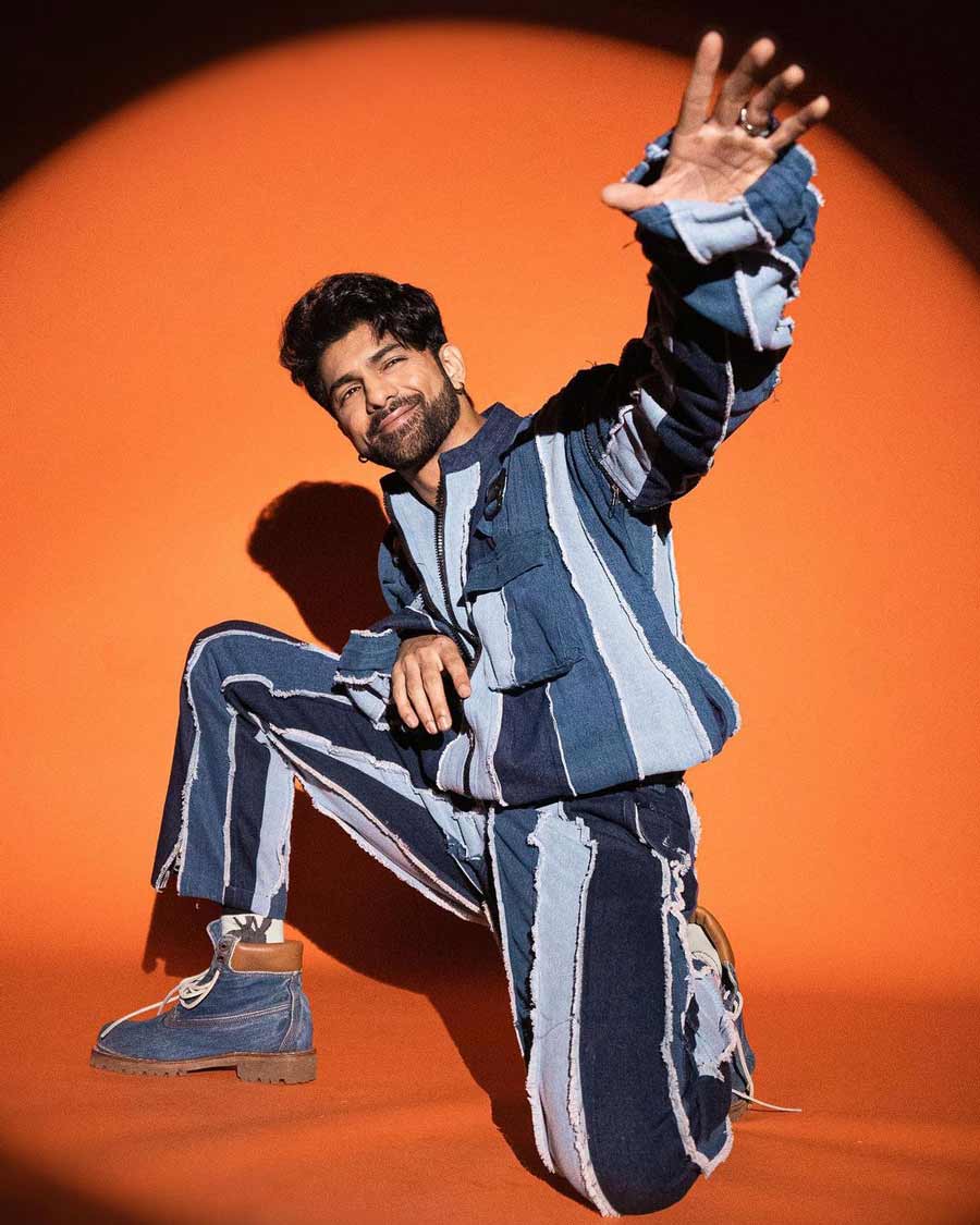 In this indigo pleated co-ord set paired with denim leather boots, Taha nails the grunge look.
