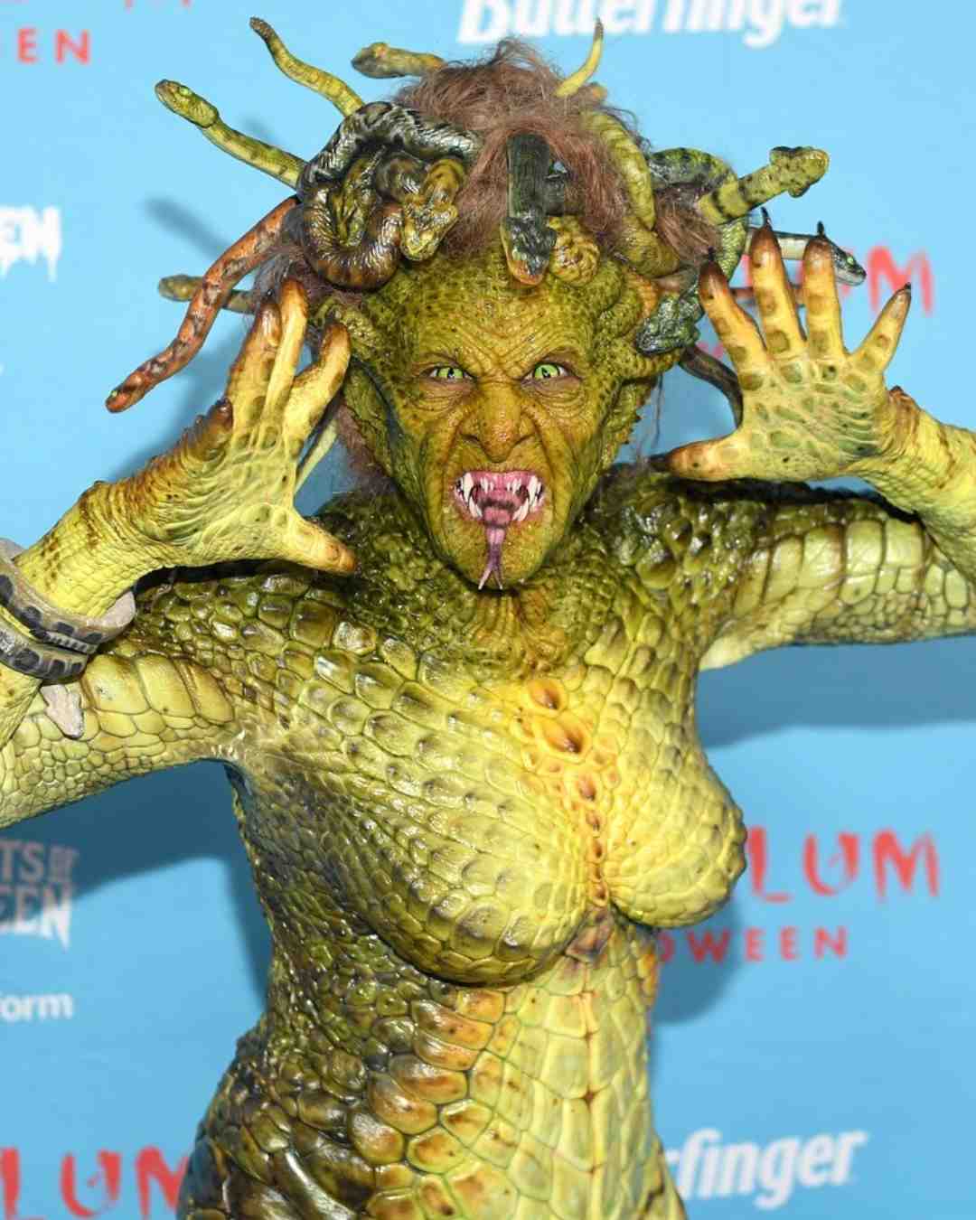 Heidi Klum’s Halloween attire this year was a Medusa-inspired outfit. It featured green scales, a headpiece with moving snakes, fangs, and a forked tongue.