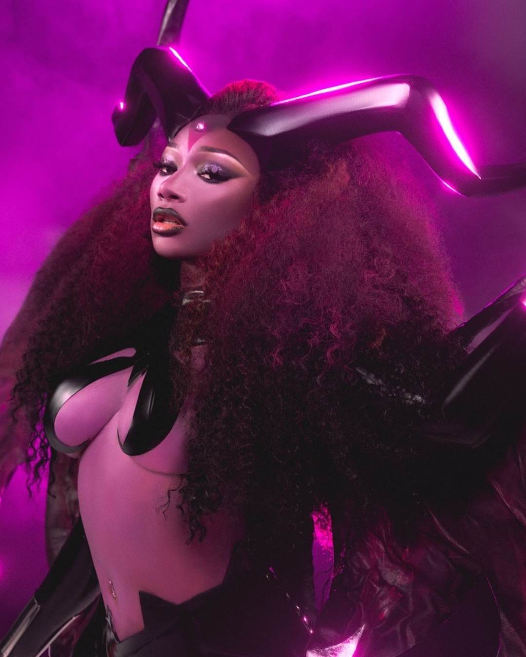 Megan Thee Stallion dressed as Drolta Tzuentes from the Netflix animated series Castlevania: Nocturne, a vampire and a major antagonist in the series.