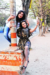 Selfie time: After strolling through Prinsep Ghat, Koel and Sayantika pose beside a lamp post. Anything for a selfie!