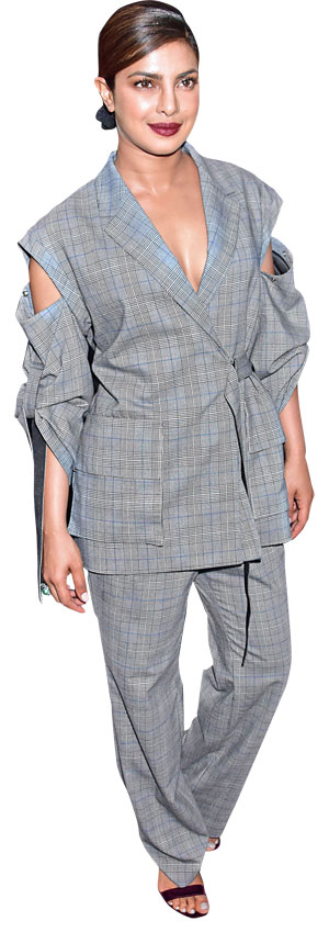 If you thought you can’t channel cold shoulder with a formal look, take a cue from Priyanka Chopra. The Baywatch villain did androgyny in a chequered grey pantsuit with a plunging neckline. Add a sleek side-parted low chignon and diamond ear studs, and PeeCee is boss babe.