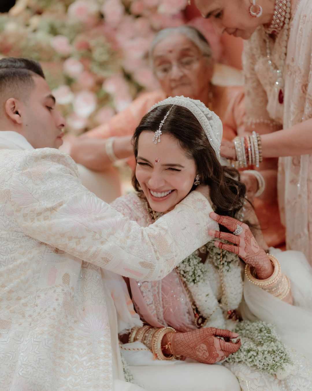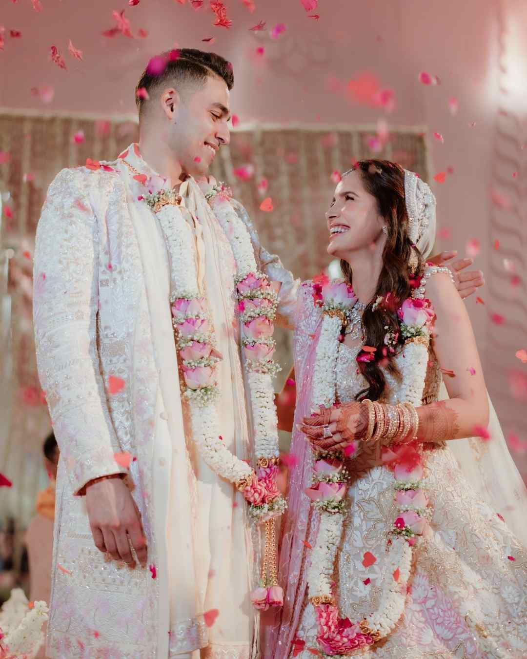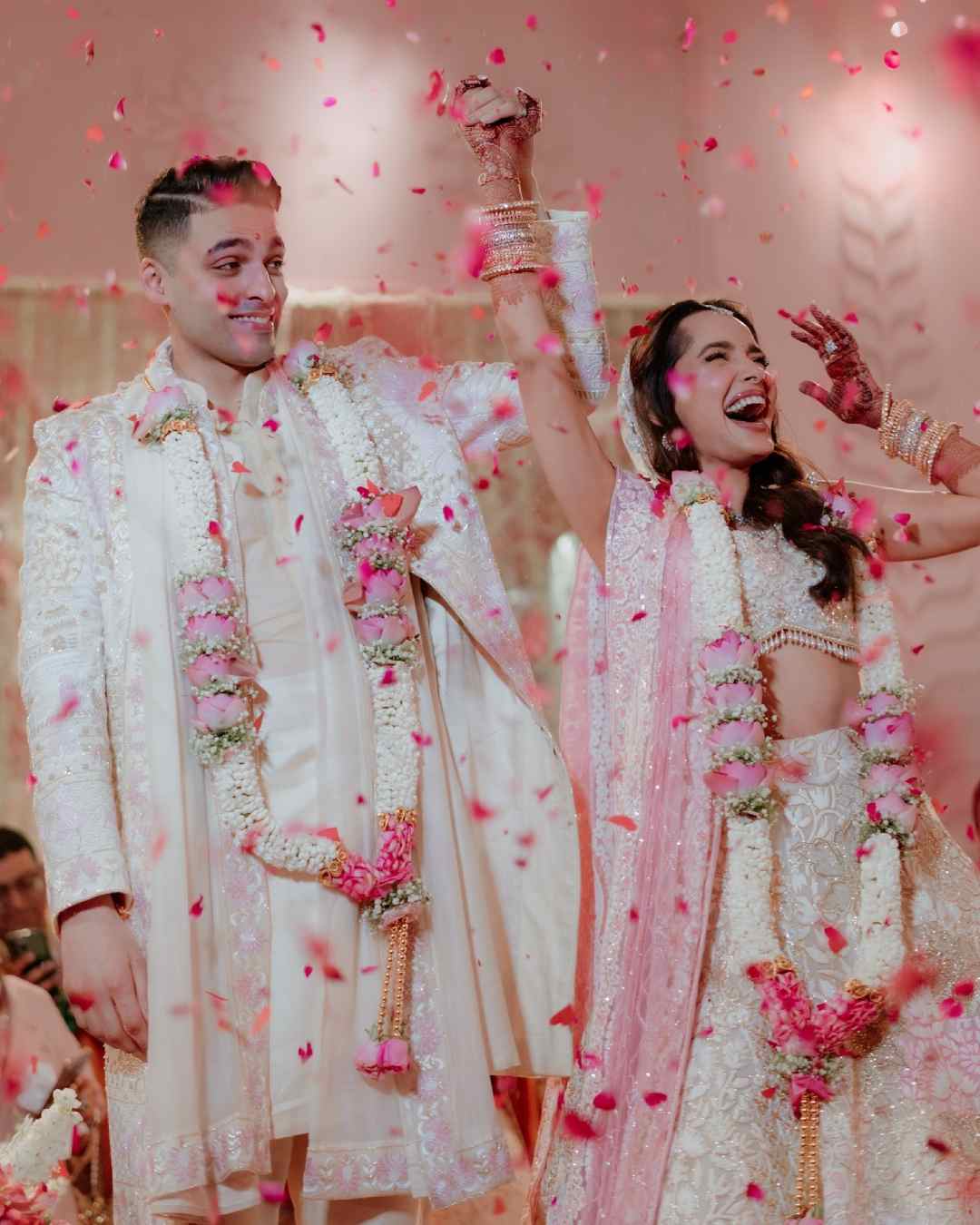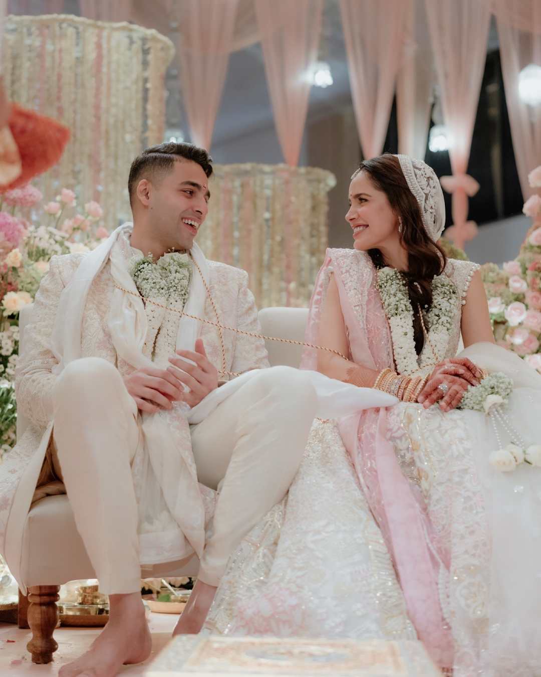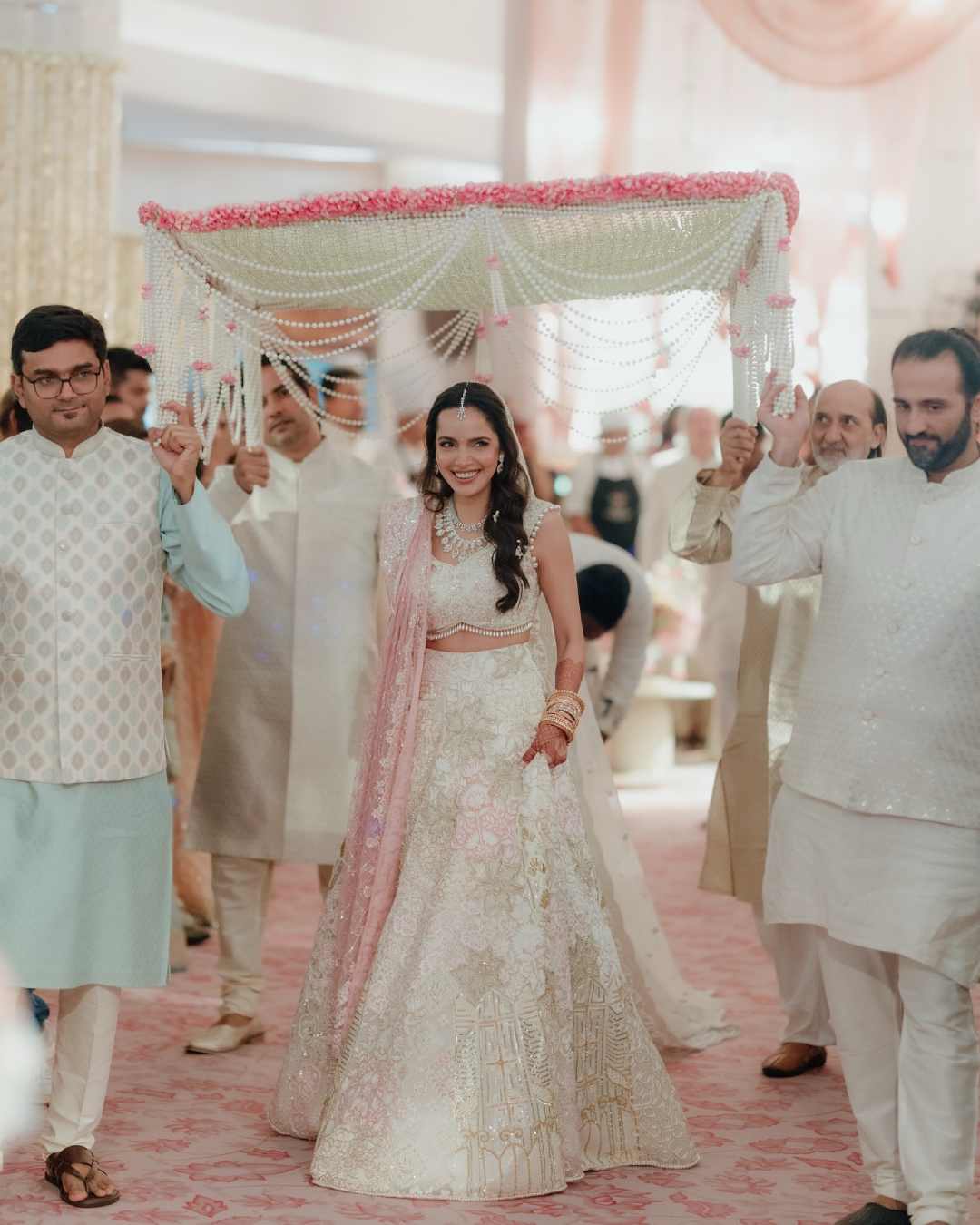 Shazahn wore an embellished ivory lehenga with pastel and blush pink undertones, paired with a matching sleeveless blouse and dupatta. Ashish complemented her in an off-white sherwani with textured embroidery.
