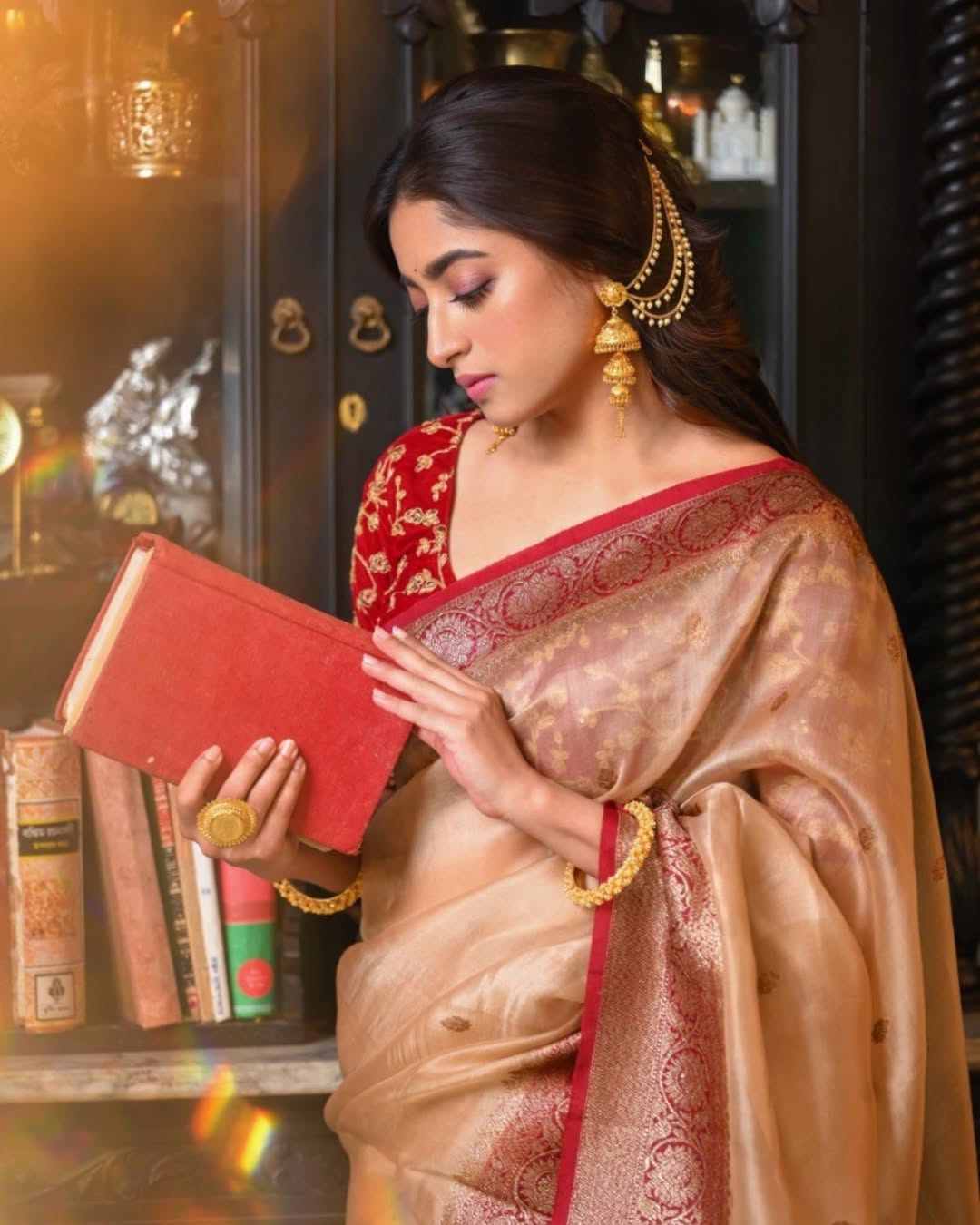 Isha Saha looked timeless in a beige-gold silk sari with a red-gold border on Poila Baisakh. She paired the outfit with statement jhumkas and a cascading hair ornament that added a touch of vintage charm.
