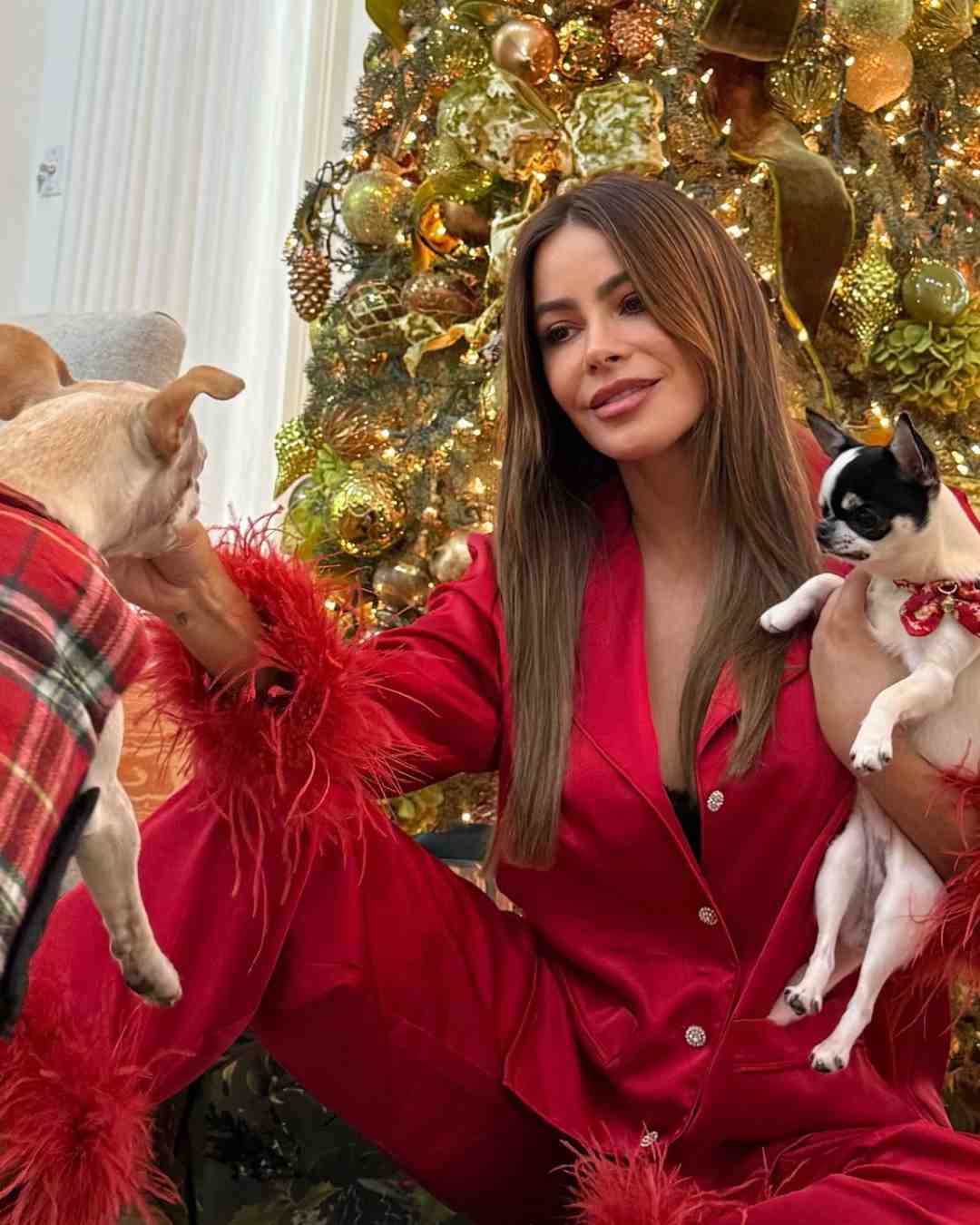 Modern Family actress Sofia Vergara kept it casual in satin red pajamas and enjoyed a laidback Christmas at home with her furry friends.