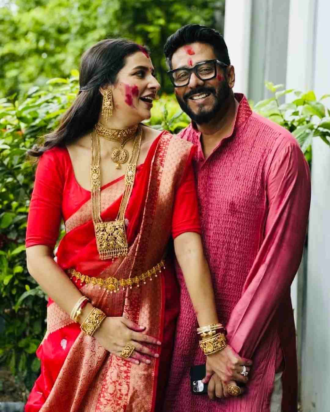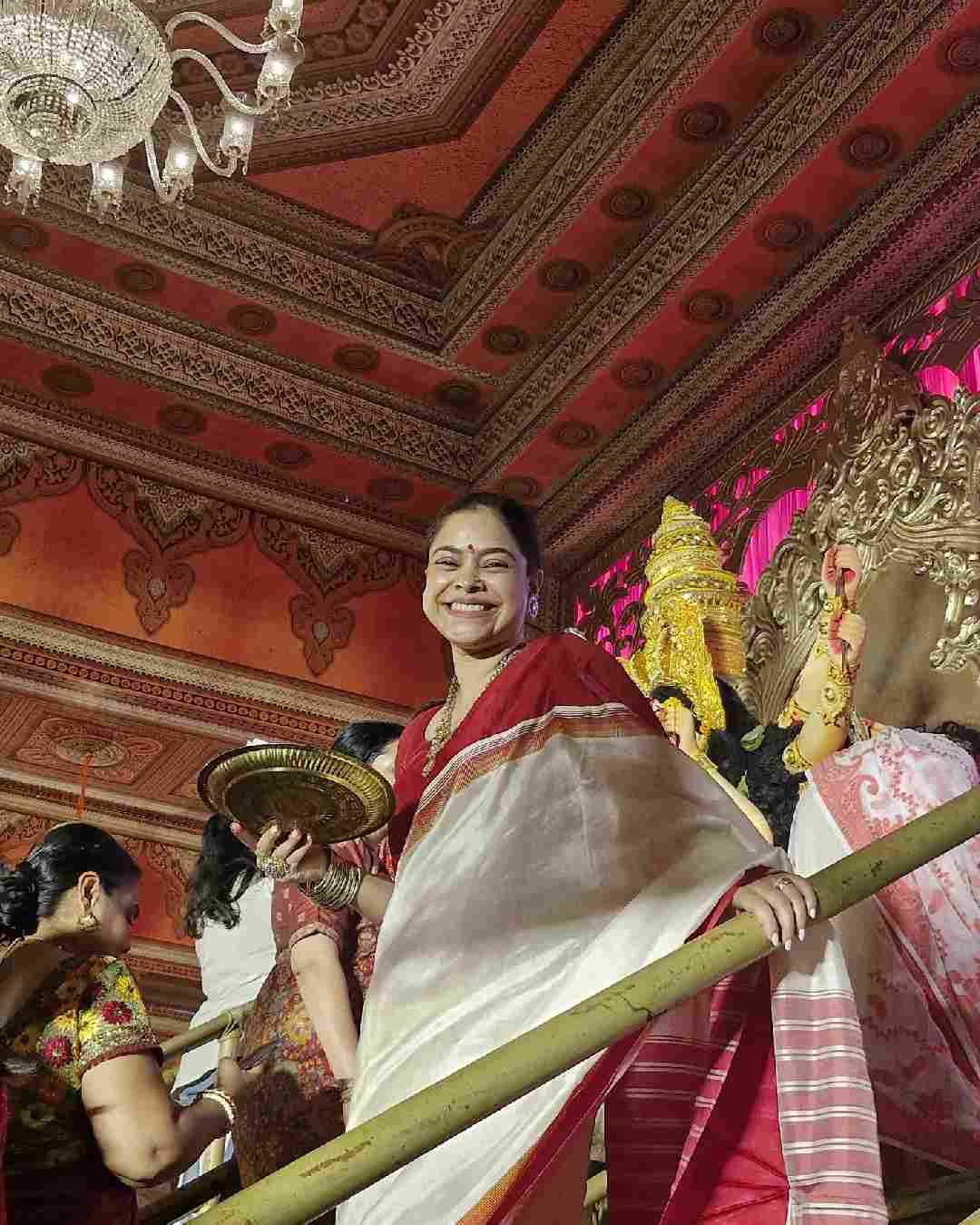 Sumona Chakraborty posed for a photo after performing the traditional Boron ritual to bid farewell to Maa Durga.