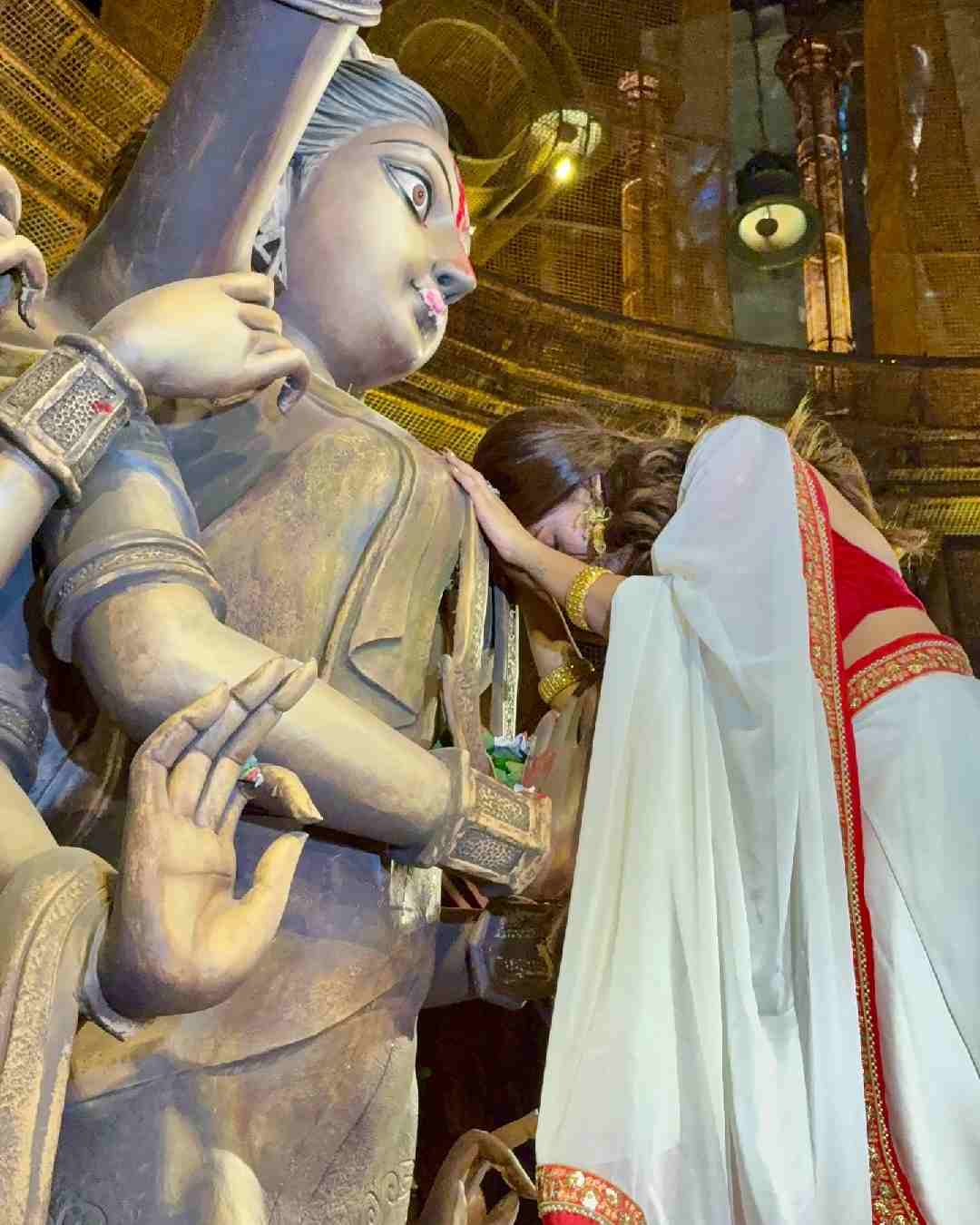 Clad in white sari with red borders, Trina Saha sought blessings from Goddess Durga.