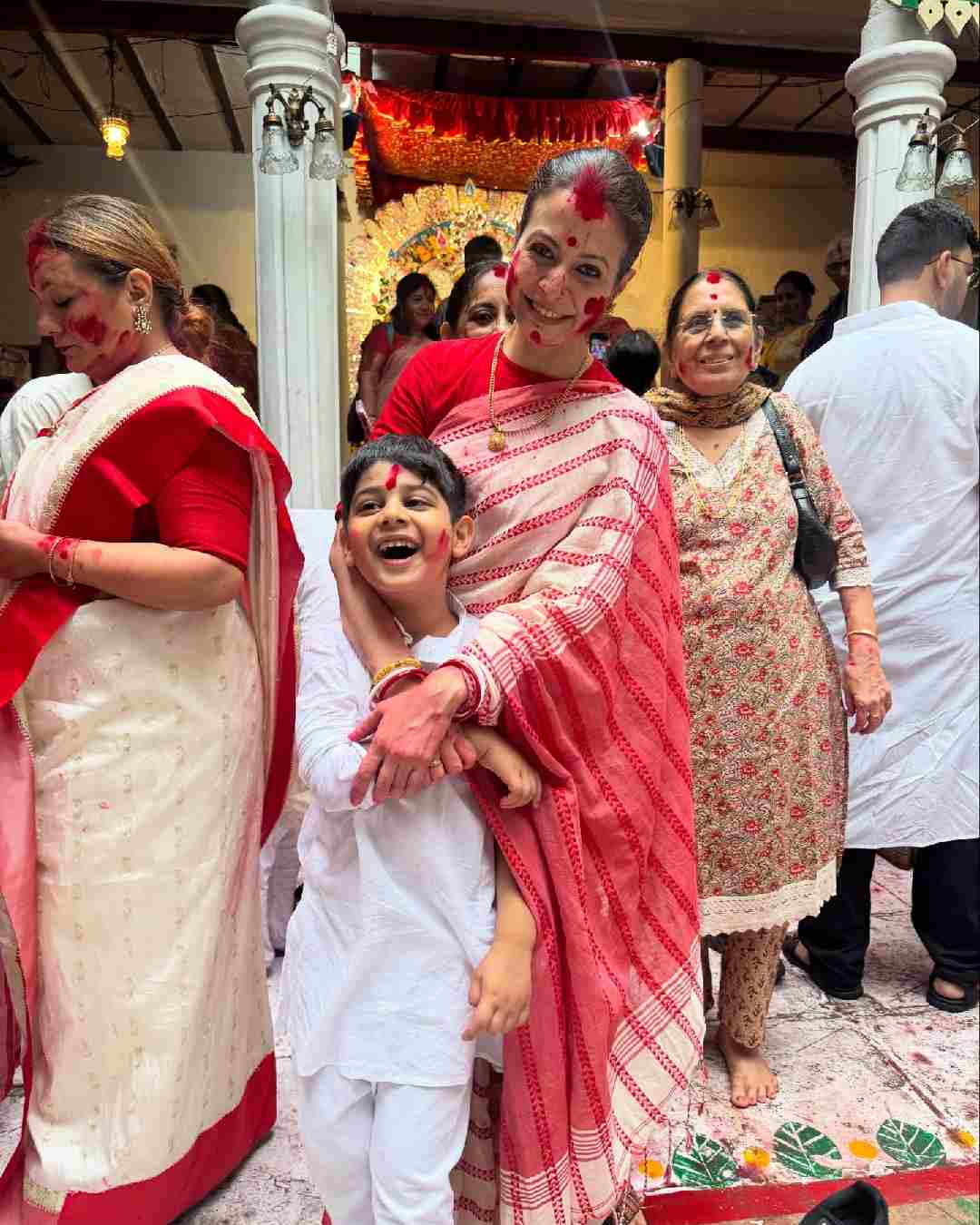 Koel Mallick was caught in a candid moment with son Kabir during Sindoor khela celebration.