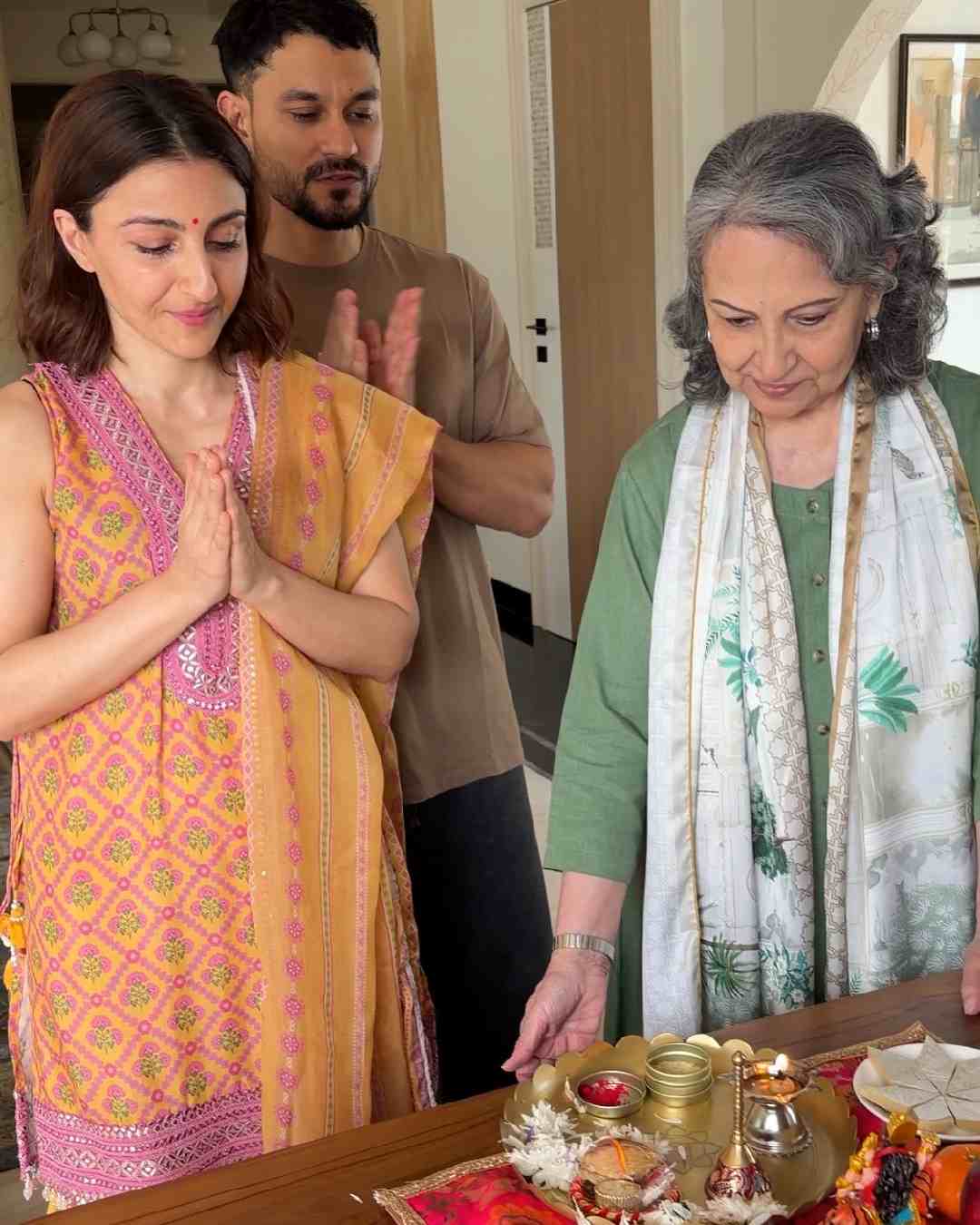 Soha Ali Khan marked Dussehra with a prayer ceremony. She was joined by husband Kunal Kemmu, mother Sharmila Tagore and daughter Inaaya.
