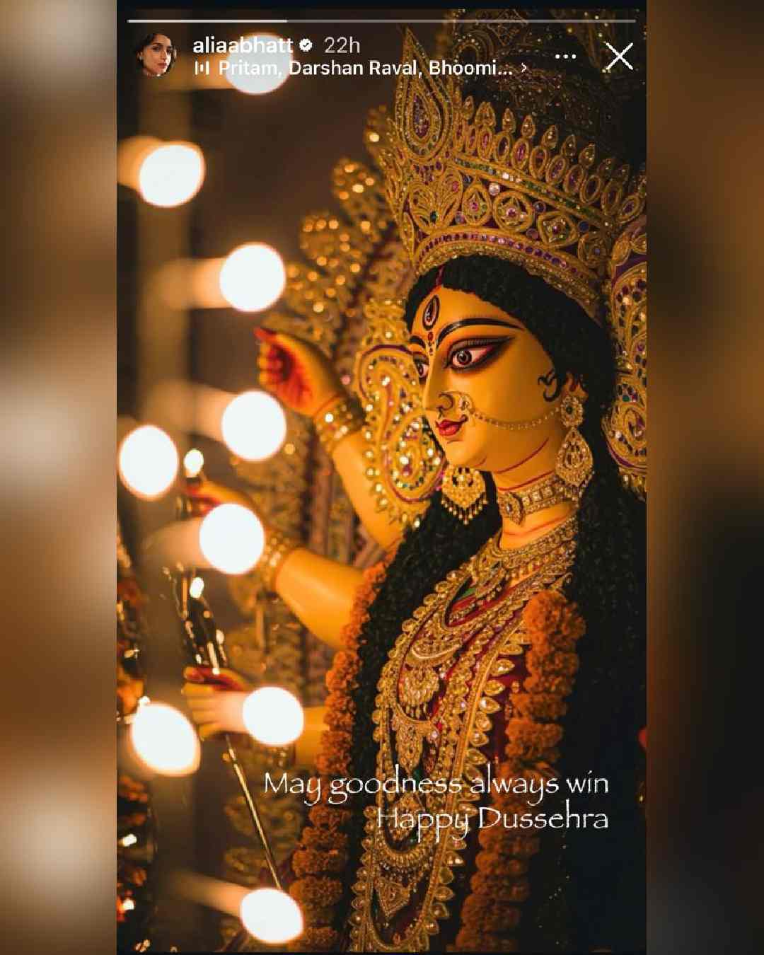 Alia Bhatt extended her wishes on Dussehra by sharing a photo of Maa Durga on her Instagram story, carrying the text, ‘May goodness win.’