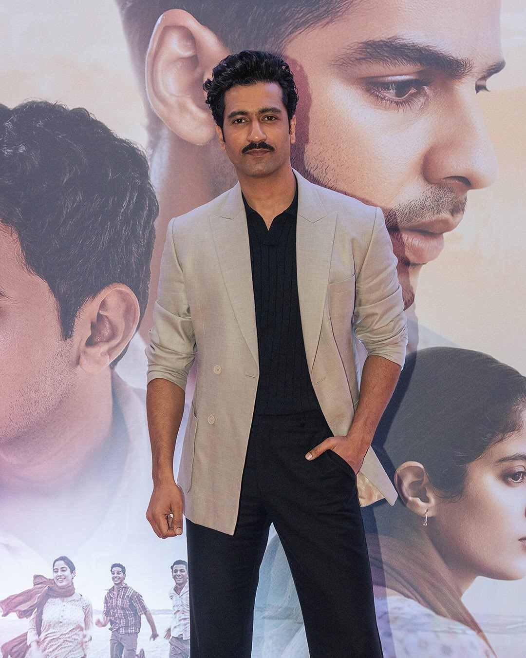 Chhaava actor Vicky Kaushal looked dapper in an ivory suit paired with a black shirt and trousers.