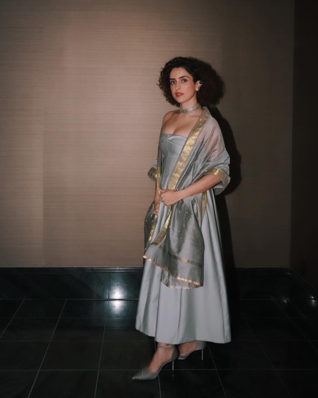Actress Sanya Malhotra looked elegant in a satin silver dress with a fitted bodice. She rounded up her look with a matching dupatta draped featuring a prominent gold border.