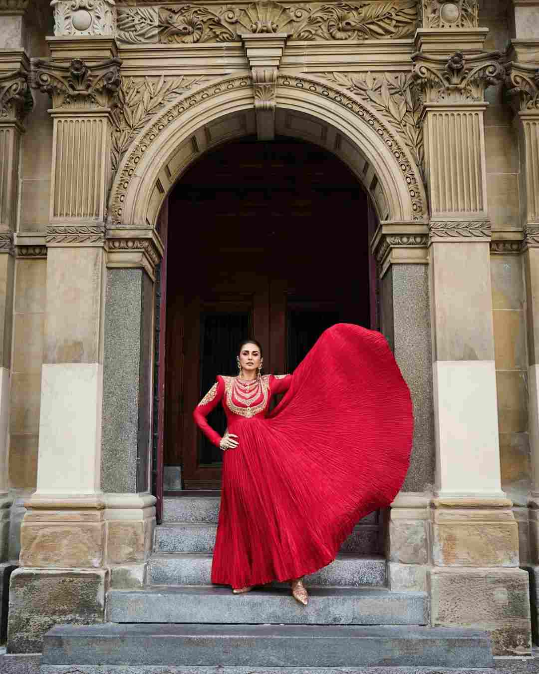 Actress Huma Qureshi dazzled in a regal, floor-length red gown featuring elaborate gold embroidery on the high neckline.