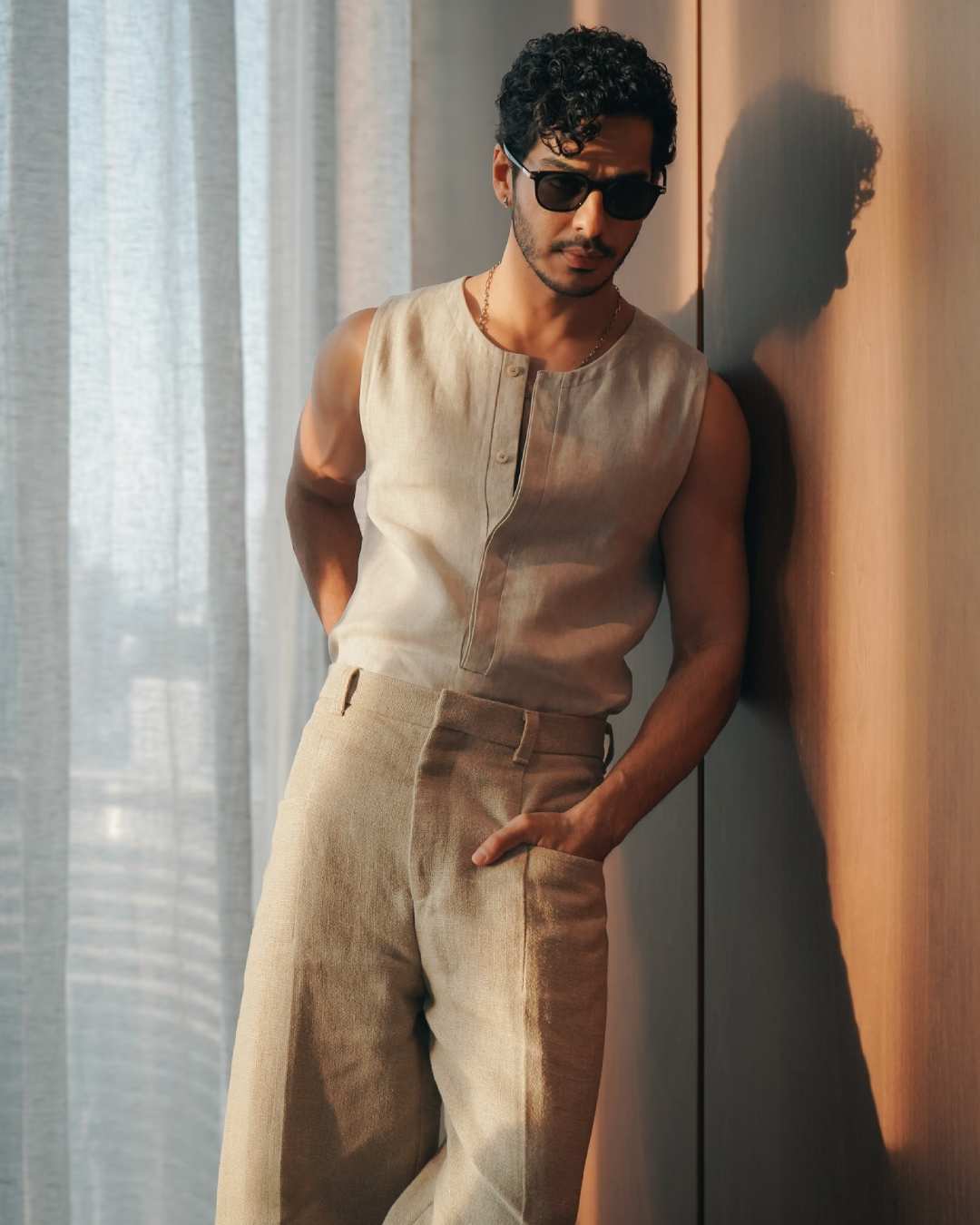 Actor Ishaan Khattar, who stars in Neeraj Ghaywan’s Homebound, looked dapper in a sleeveless shirt with beige trousers and chic sunglasses.