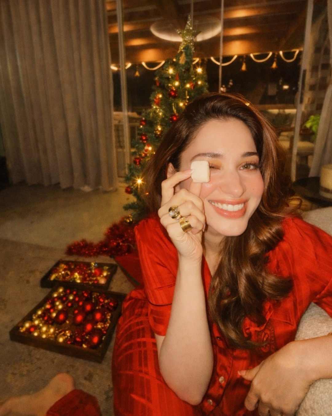 Oodela star Tamannaah Bhatia turned dazzled in a ravishing red ensemble for Christmas and spent the festive night indulging in cookies and marshmallows.
